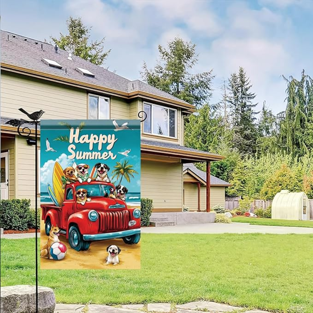 - Summer truck garden flag size: Measuring 12 x 18 inches with a 2-inch sleeve, this Summer Dogs Red Truck Beach Garden Flag fits most standard flagpoles. It’s lightweight yet durable enough to stay upright throughout the holiday season. Note: Includes 1 summer garden flag—flagpole and stand not included.