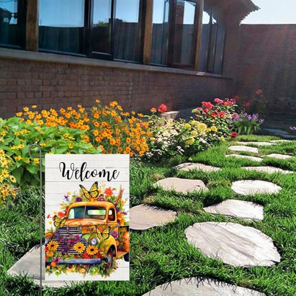 Spring Garden Flag Retro Yellow Truck Floral Welcome Yard Flag 12×18 Inch Double Sided Pickup Flowers Butterflies Spring Decorations Small Garden Flag Home Outdoor Yard Lawn Decor